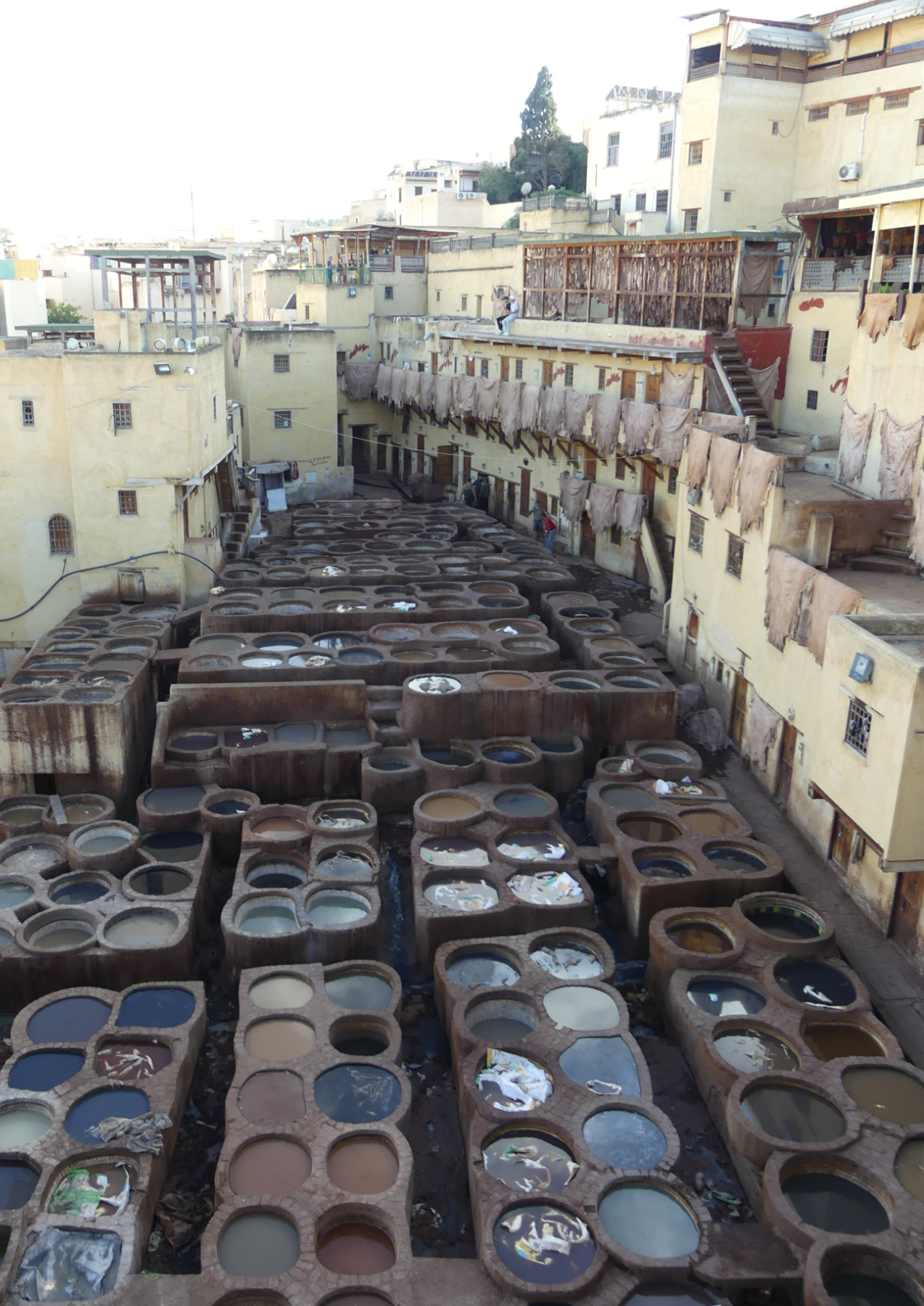 Fès, eine der fünf Königsstädte, gilt als kulturelle, religiöse und spirituelle Hauptstadt Marokkos. Zugleich ist sie seit 1981 UNESCO-Weltkulturerbe. Der marokkanische Reiseleiter zeigte bei einer Stadtführung mit großer Begeisterung die engen Gassen der Altstadt und führte an reichhaltigen und farbenfrohen Obst- und Gemüseständen vorbei zu den Gerbereien. Durch das enge Treppenhaus eines unscheinbaren Hauses kam man zu einem Balkon. Im goldenen Licht der Sonne glitzerten die weltberühmten Farbtöpfe, in denen das Leder zuerst von den Tierhaaren befreit und dann eingefärbt wird. Die Menschen, die dort arbeiten, stehen barfuß in den Farbtöpfen und erledigen den ganzen Tag über in der Sonne eine anstrengende Arbeit. Ein sehr strenger Geruch herrscht in diesem Gerberviertel. Frische Minzblätter helfen, diesen Duft zu übertönen.