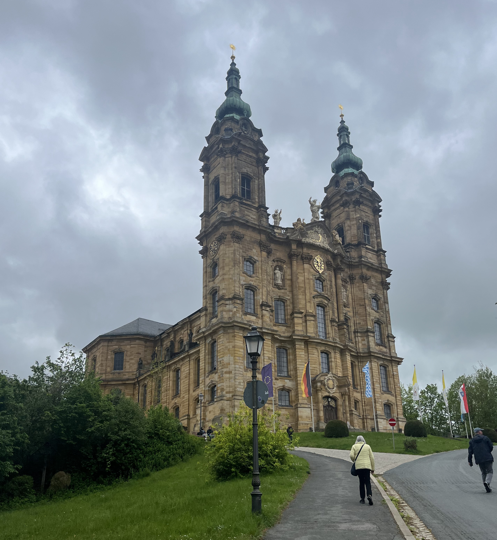 Zum Schluss ging es zur Basilika Vierzehnheiligen. Einige besuchten die Heilige Messe, nach deren Ende aber konnte jeder das Gotteshaus auf sich wirken lassen. Zweierteams stellten die vierzehn Nothelfer (Nomen!) vor und traten in einem Kahoot!-Quiz gegeneinander an. Währenddessen gesellte sich überraschend ein Gast zur Besuchergruppe: Pater Werner Reischmann. Der Franziskaner berichtete aus seinem Leben, verschenkte Postkarten mit seinen Fotografien (und Schokolade …) und spielte zur abschließenden Krönung auf seiner Mundharmonika.