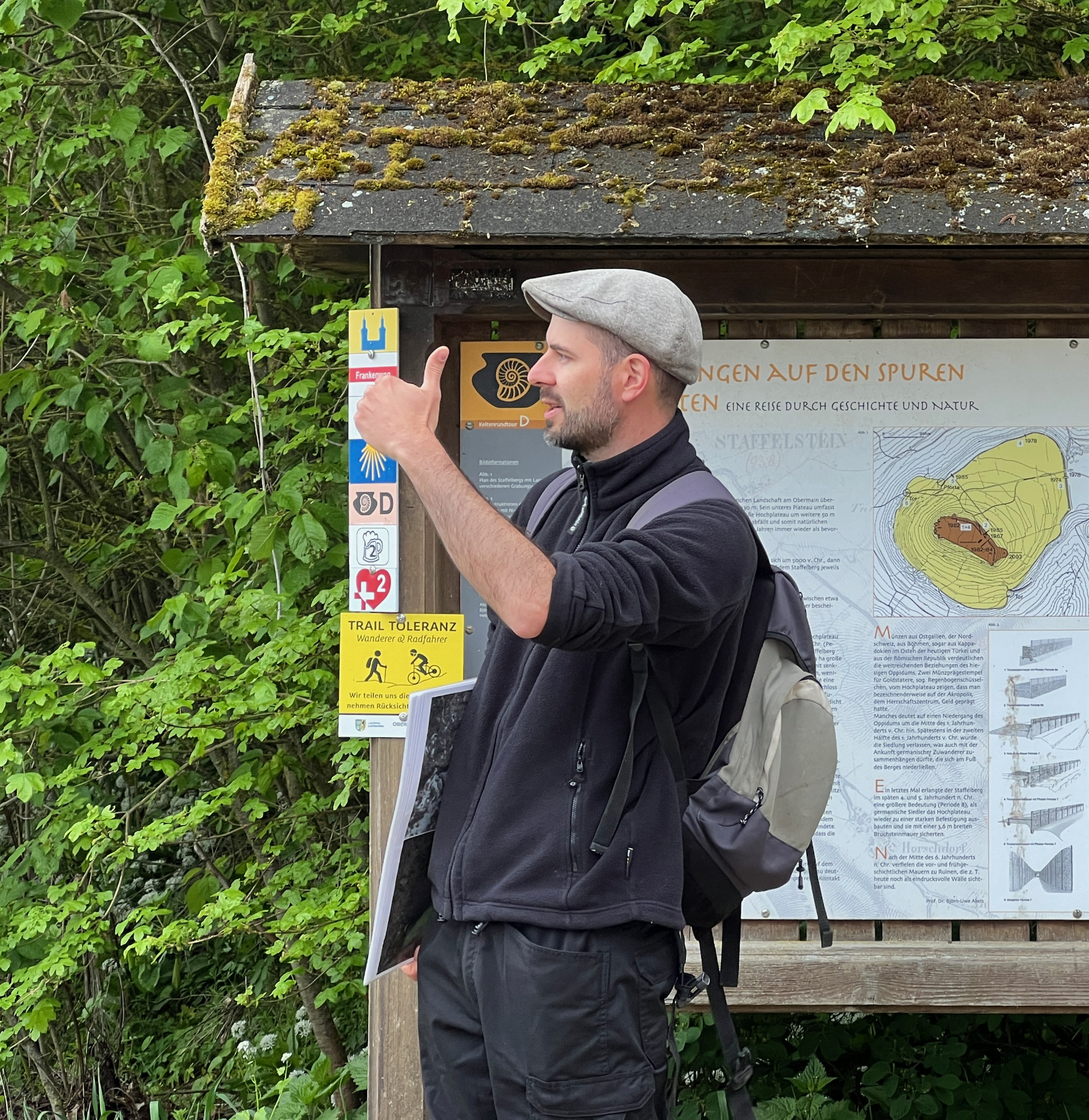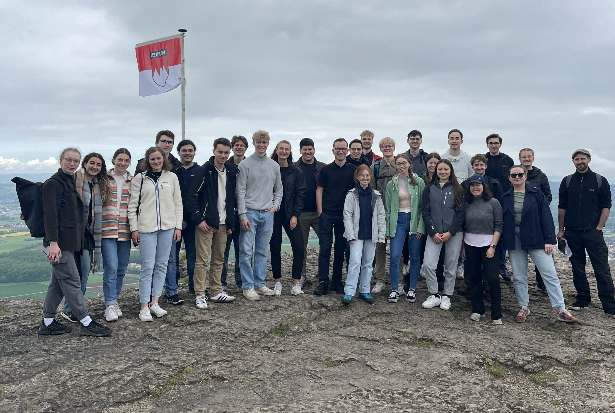 Frühmorgens ging es dann bereits um 8.30 Uhr zum Staffelberg. Dort erläuterte Philipp Schinkel (M. A.), Archäologe am Institut für Fränkische Landesgeschichte (IFLG), das keltische Oppidum auf dem Staffelberg – oder besser gesagt, dessen Überreste. Unter dem Eintrag „oppidum“ ist in den einschlägigen Lateinwörterbüchern die deutsche Bezeichnung „Stadt“ hinterlegt; genauer wäre freilich eine Umschreibung wie „stadtähnliche Ansiedlung“. Nichtsdestotrotz war es eine horizonterweiternde Erfahrung, sich die beeindruckende Anlage mit ihren erstaunlich robusten Bauwerken und Lebensweise vor über 2000 Jahren vorzustellen. Dem gegenüber stand die (sehr reale) Aussicht, die mit Kaffee und Kuchen bewundert wurde.