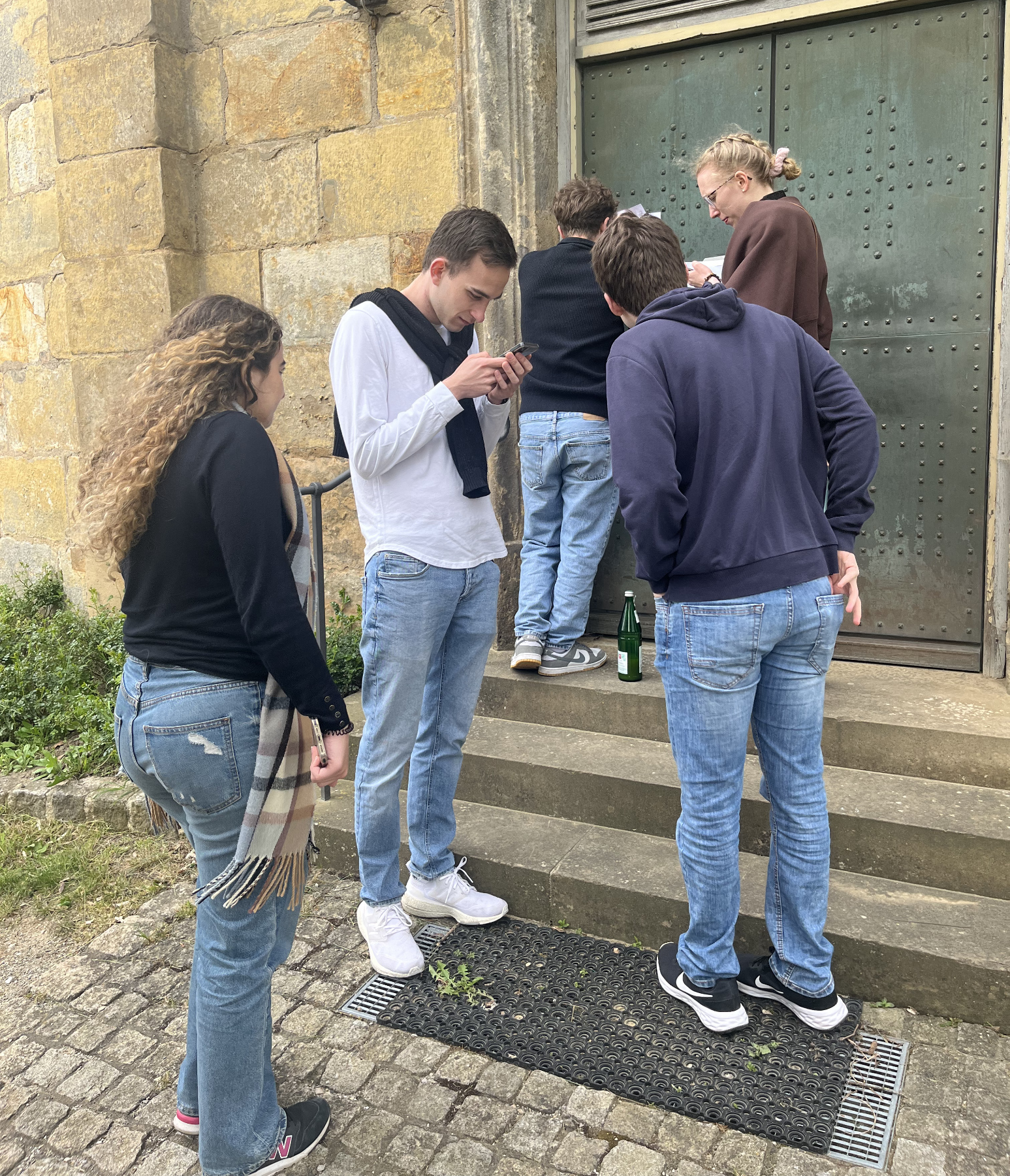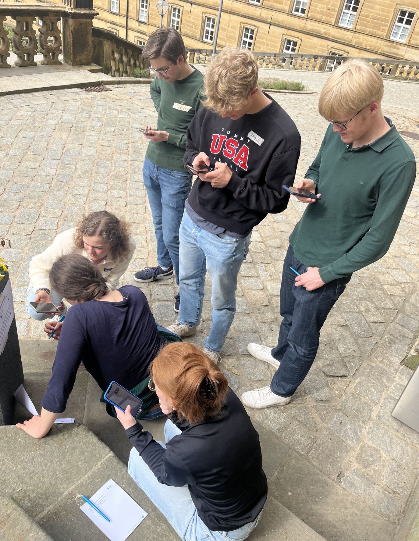 Nach der Mittagspause begaben sich vier Gruppen auf eine Schnitzeljagd durch Kloster Banz. Die Beantwortung der Fragen erfolgte mithilfe im Voraus zusammengestellter Links und erforderte sehr viel Präzision. So wollte man beispielsweise wissen, wann und durch wen Kloster Banz gegründet wurde (1096 von Markgraf Hermann von Baden), wann dieses säkularisiert wurde (1803), aber auch, welches Gebäude bis 1814 auf der Maintalterrasse stand (ein Krankenhaus). Es galt, die Lösungsbuchstaben aus zwanzig Fragen in die richtige Reihenfolge zu bringen – und die Gruppe, die als erstes das Abtszimmer erreichte, gewann einen Kasten mit Erfrischungsgetränken. Nicht nur das imposante Abtszimmer wurde während der Schnitzeljagd entdeckt, auch andere, oft verschlossene Türen öffneten sich, etwa zum Fürstenzimmer und dem Kaisersaal.