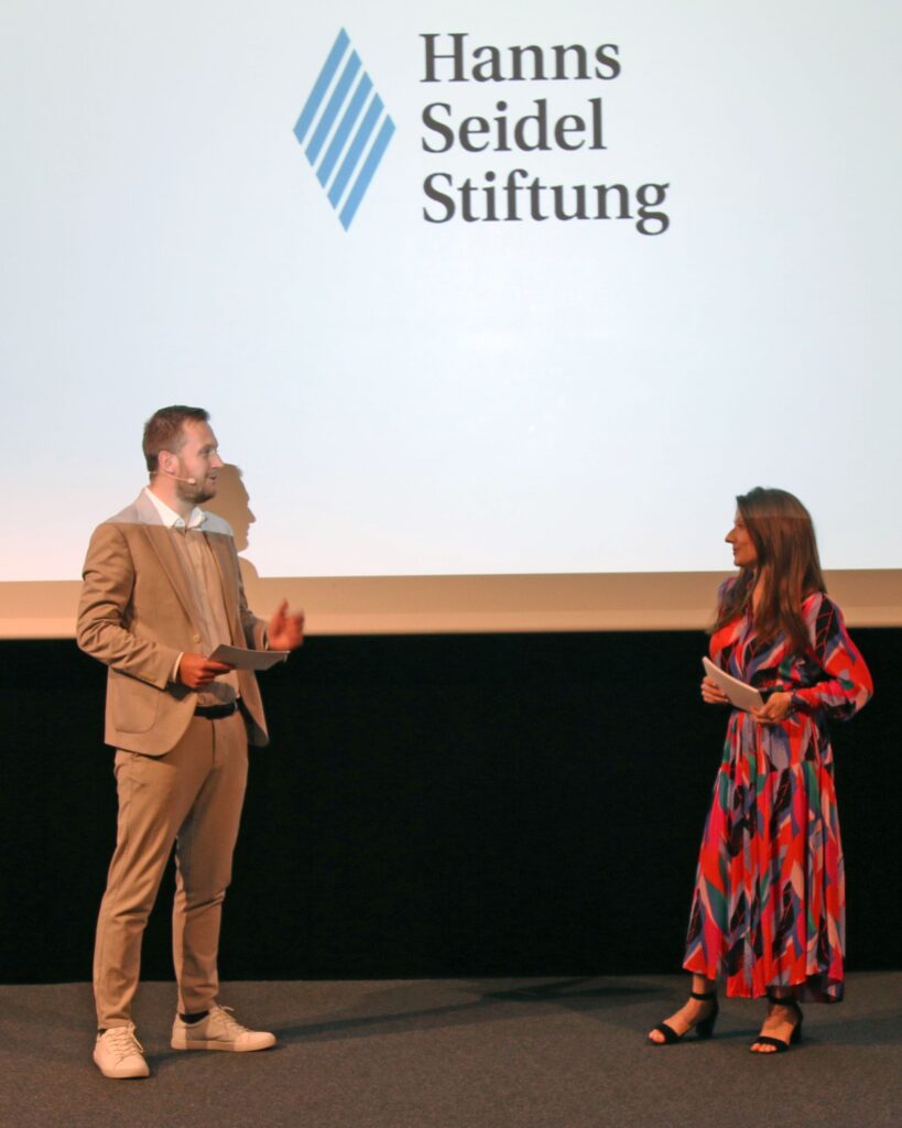 Juryvorsitzender Dr. Jonas Schützeneder bei der Preisverleihung mit Moderatorin und Altstipendiatin Christina Matallinos. Foto: HSS.